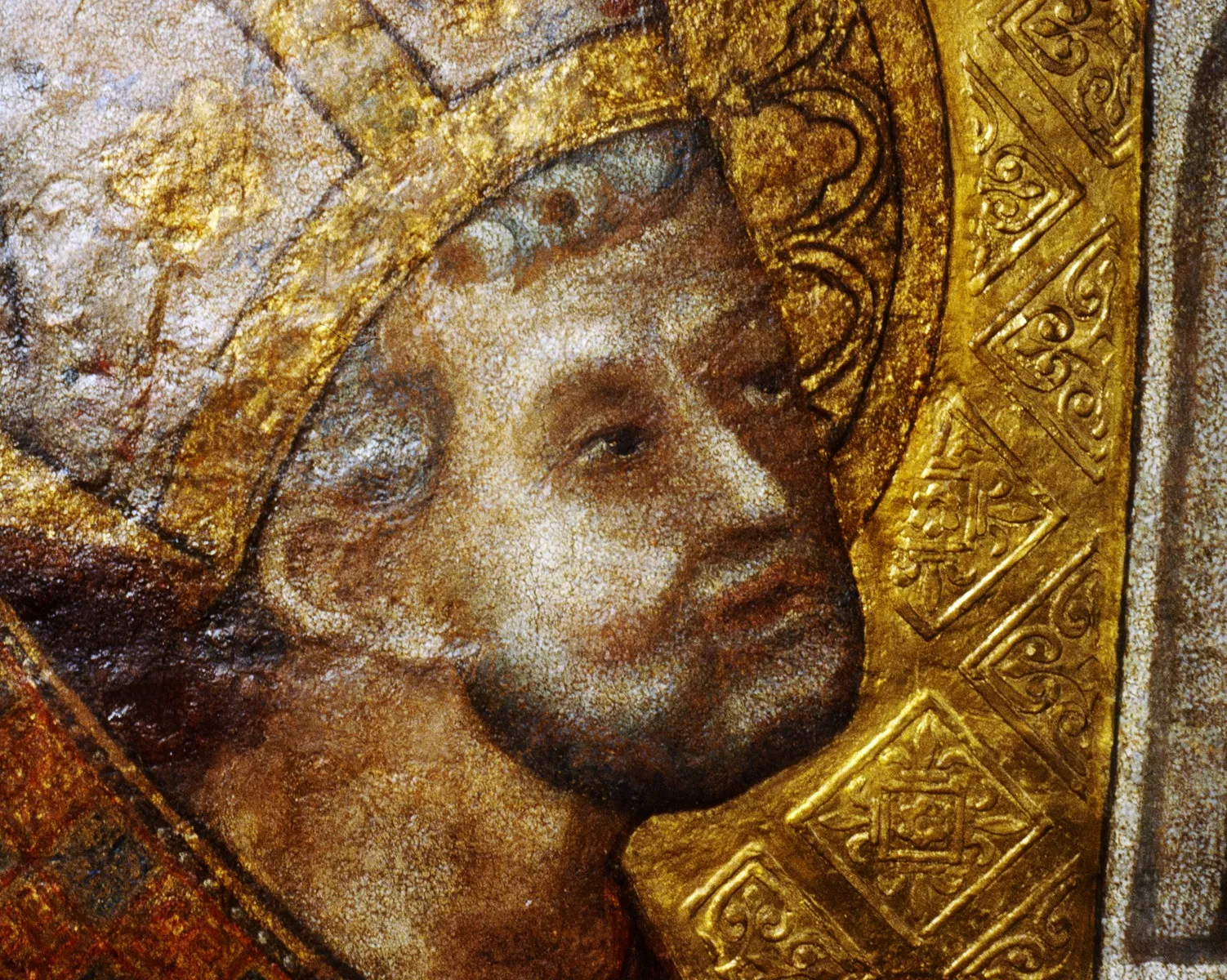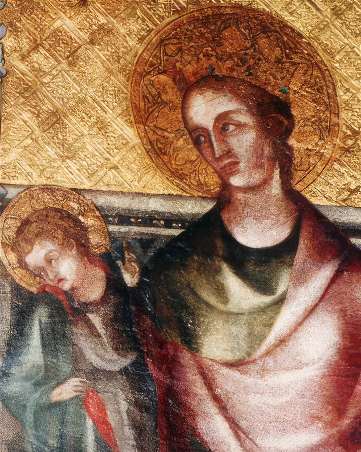Après enlèvement des repeints, nous avons pu retrouver la texture originale de la peinture avec ses fines craquelures dues à l’emploi de l’oeuf dans le médium (cf. tête de St Nicaise)et surtout la cohérence du dessin et de la forme, redonnant aux regards toute leur expression, leur force.