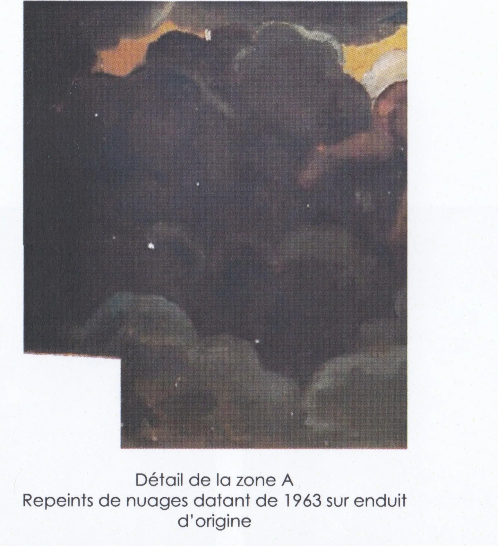 Les îlots de peinture de Louis Chaix subsistaient sous le nuage noir d’une restauration antérieure. Après avoir dégagé les repeints, on a pu retrouver les joues gonflées de zéphyr et reconstituer le visage du personnage.