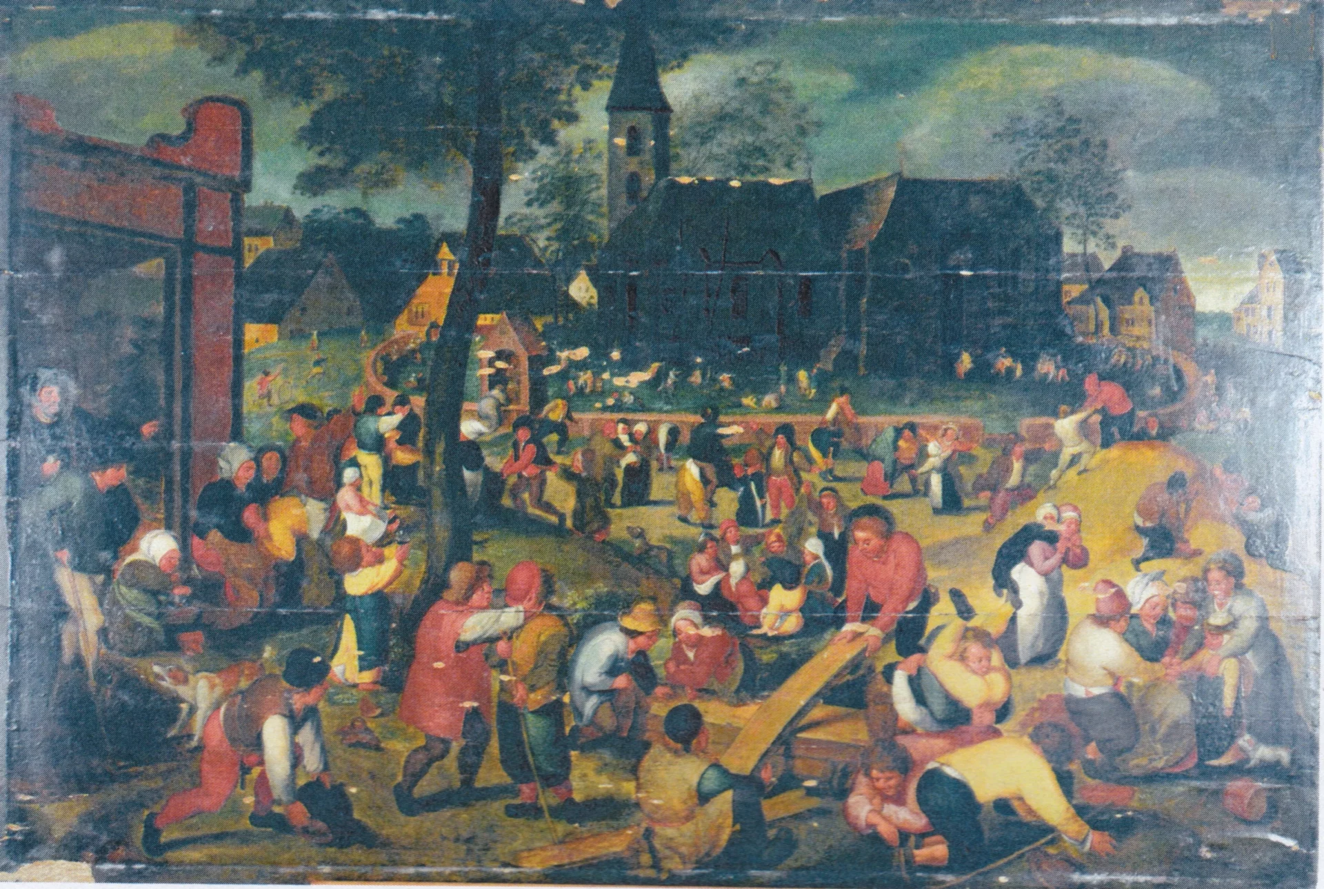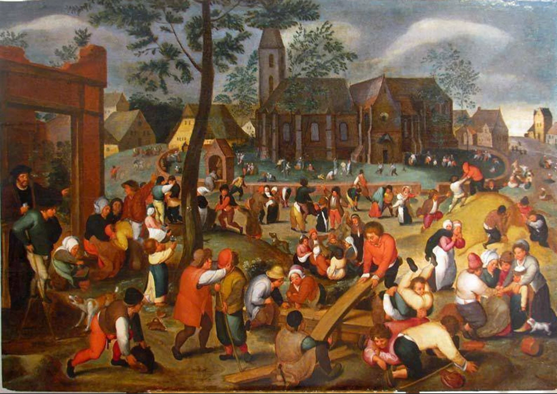 Dans ce tableau intitulé « jeux d’enfant », deux enfants jouent devant la porte du transept de l’église à la toupie avec une tête d’homme coupée !